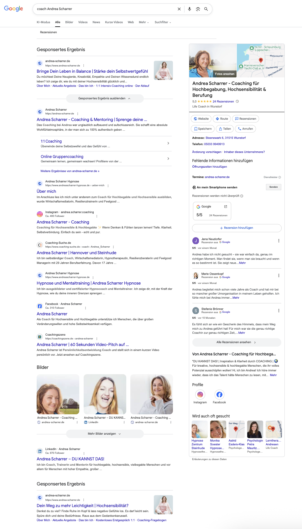 Seite 1 der Google-Treffer ist bisher stark von Scharrers eigenen Assets geprägt. Ganz oben stehen zwei gesponserte Einträge (Ads) zur eigenen Website bzw. zu ihrem Coaching-Programm. Darunter folgen ein Google-Brancheneintrag (Coaching für Hochbegabung/Hochsensibilität) mit 5,0-Sternen (24 Bewertungen) sowie die offizielle Web-Adresse mit Sitellinks. Auch Facebook-, Instagram- und LinkedIn-Profile von Scharrer tauchen auf. Externe redaktionelle Quellen fehlen weitgehend. In Summe deutet dies auf eine konsistente, aber sehr selbstgemachte Präsenz hin: Sie kontrolliert viele Ergebnisse, doch es gibt kaum unabhängige Expertenstimmen oder Medienzitate, die die Glaubwürdigkeit stärken.